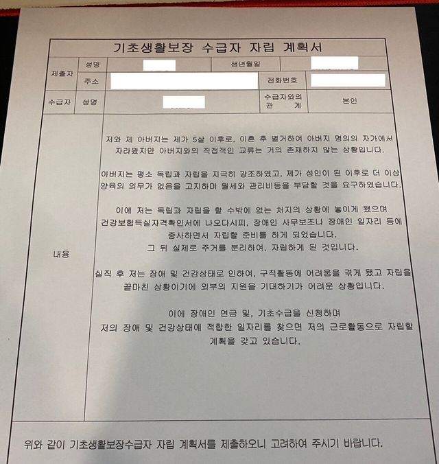 글쓴이가 구청에 제출한 기초생활 수급자 자립 계획서 / 에펨코리아