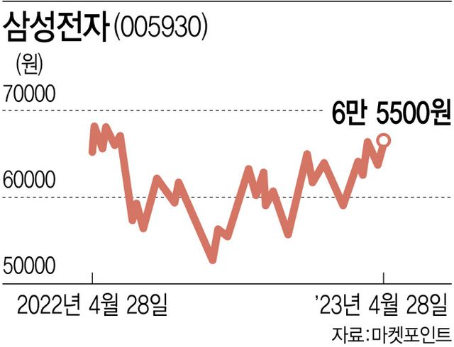 1일 마켓포인트에 따르면 삼성전자는 지난 한 달(4월 3~28일)간 1500원(2.34%) 상승하며 6만5500원에 거래를 마쳤다. 같은 기간 코스피의 상승률(1.00%)보다 양호한 모습이다.