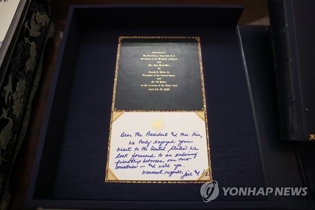 바이든 대통령은 사진첩에 동봉된 친필 메모에서 "윤 대통령님 내외분의 미국 방문은 저희에게도 진심으로 즐거운 시간이었다. 양국 간, 그리고 우리들 사이의 우정이 더욱 증진되기를 고대한다"는 인사를 남겼다.