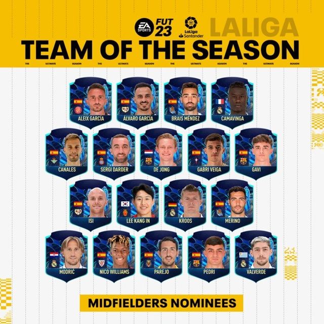 이강인이 미드필더 부문에 이름을 올렸다. 이강인과 함께 이름을 올린 미드필더들을 보면 토니 크로스, 루카 모드리치, 페데리코 발베르데, 에두아르도 카마빙가(이상 레알 마드리드), 프렌키 더 용, 페드리, 가비(이상 바르셀로나), 브라이스 멘데스, 미켈 메리노(이상 레알 소시에다드)가 있다.