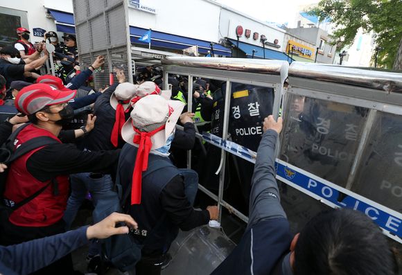 [아이뉴스24 김동현 기자] 업무방해 등 혐의를 받는 전국민주노동조합총연맹(민주노총) 간부가 법원 앞에서 분신을 시도했다.
