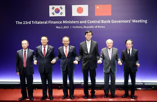 2日,韩中日财政部长及央行行长会议在仁川松岛举行。左起依次为中国人民银行国际司副司长陈劲、中国财政部副部长王东伟、韩国副总理秋庆镐、韩国央行行长李昌庸、日本财务大臣铃木俊一和日本央行行长植田和男。【图片提供 韩联社】