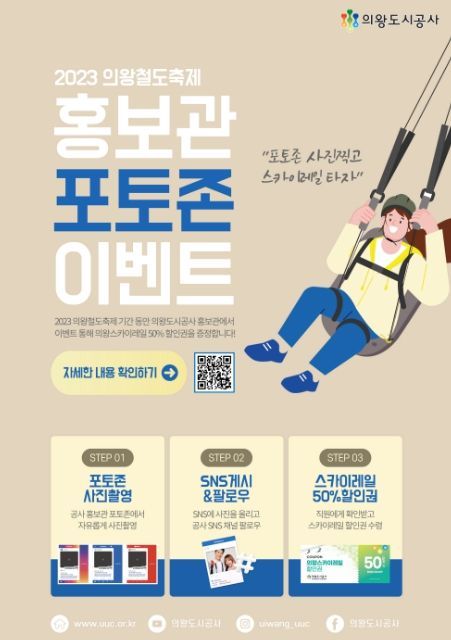 포토존 이벤트 참여방법은 홍보관 앞 포토존에서 촬영 후, 참여자 개인 SNS에 사진을 게시하고 의왕도시공사 공식 SNS채널(인스타그램,페이스북,유튜브)을 팔로우 및 구독 완료하면 된다. 이를 홍보관 내 의왕도시공사 직원에게 확인 및 인증만 하게 되면, 스카이레일 50% 할인권을 증정받을 수 있다.