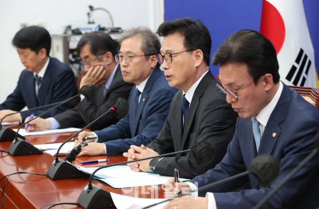 박광온(오른쪽에서 두번째) 더불어민주당 신임 원내대표가 2일 오전 서울 여의도 국회에서 열린 원내대책회의에서 모두발언을 하고 있다.(사진=노진환 기자)