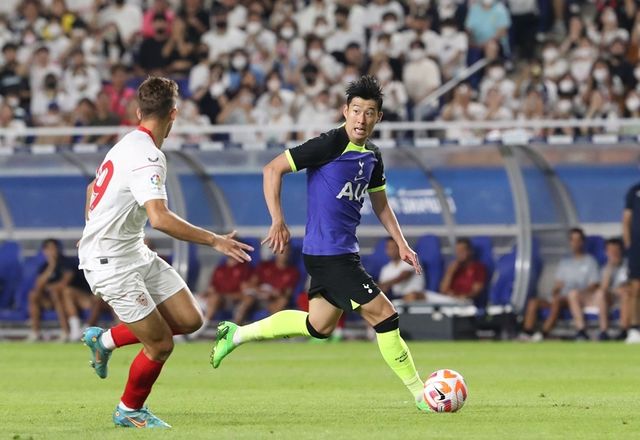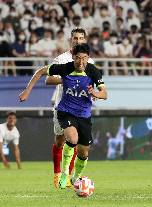 손흥민이 지난해 7월 16일에 경기 수원시 팔달구 수원월드컵경기장에서 열린 쿠팡플레이 시리즈 2차전 토트넘 홋스퍼와 세비야FC의 경기에서 상대 진영으로 돌파하고 있다. / 이하 뉴스1