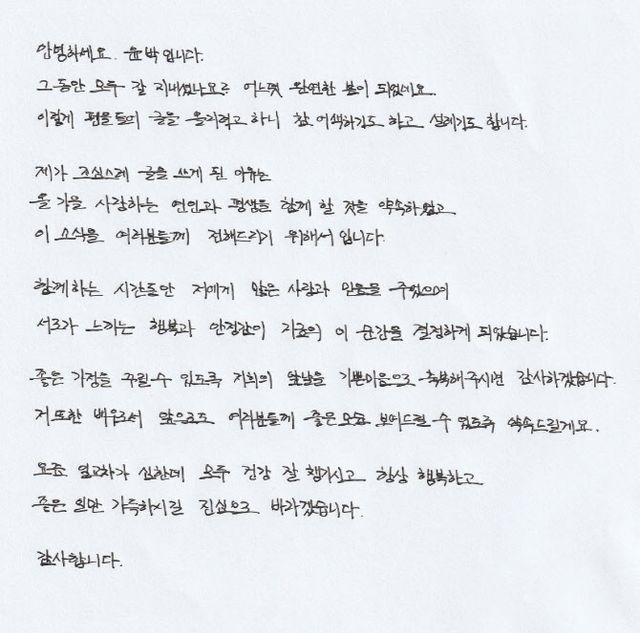 윤박은 이날 자신의 SNS 계정을 통해 공개한 자필 편지를 통해 “좋은 가정을 꾸릴 수 있도록 저희의 앞날을 기쁜 마음으로 축복해주시면 감사하겠다. 저 또한 배우로서 앞으로도 여러분께 좋은 모습을 보여드릴 것을 약속하겠다”고 전했다.