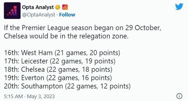 흥미로운 기록도 나왔다. 축구 통계 매체 '옵타'에 따르면 첼시는 지난해 10월 29일에 있었던 EPL 14라운드 브라이튼전 패배 이후 결과를 기준으로 강등권에 해당하는 결과를 거뒀다. 22경기 동안 벌어들인 승점은 고작 18점에 불과할 정도다.