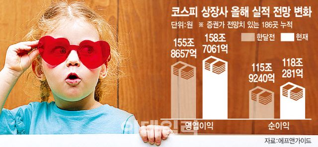 1분기 실적이 잘 나오자 증권가는 서둘러 올해 기업 실적을 상향하고 있다. 한 달 전만 해도 증권가의 연간 실적 전망치가 있는 코스피 상장사 186곳의 영업이익 합계는 155조8657억원이었지만 현재 158조7061억원으로 1.8% 증가했다. 순이익 역시 118조281억원으로 한 달 전(115조9240억원)보다 1.8% 늘었다.