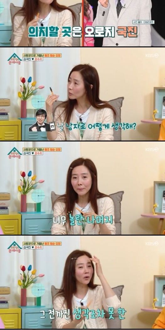 송은이는 "우리 앞에서는 덤덤한 척하는데 국진 오빠 앞에서 혓바닥이 나오더라"며 강수지의 애교를 증언하기도 했다.