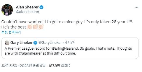 종전 기록을 보유했던 앨런 시어러는 자신의 SNS를 통해 "더 좋은 선수에게 이 기록이 가길 바랄 수는 없었을 것이다. 겨우 28년이 걸렸다. 그는 최고다"라며 홀란이라는 엄청난 선수가 자신의 기록을 갈아치웠다고 감탄했다.