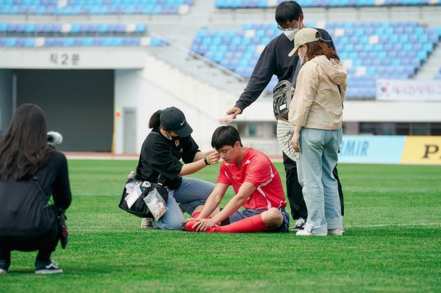 박서준의 표현처럼 축구장에서 긴팔을 입고 있는 스태프들과 달리 반팔의 축구 유니폼을 입은 박서준은 다소 지친듯한 표정으로 선풍기 바람을 쐬고 있다. 또한 카메라가 켜져있을 때 몰입하는 그의 모습 역시 눈길을 끈다.