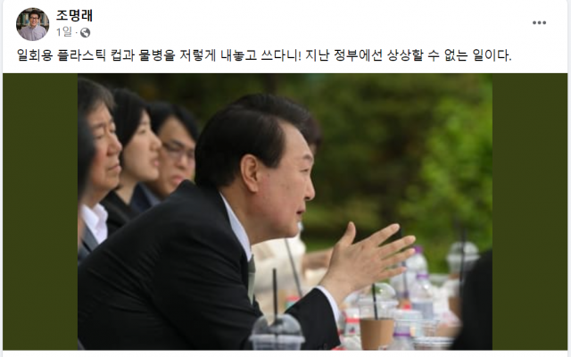 조 전 장관은 지난 2일 용산 대통령실 앞마당에서 진행된 오찬 간담회 당시 사진을 자신의 페이스북에 올리며 "일회용 플라스틱 컵과 물병을 저렇게 내놓고 쓰다니! 지난 정부에선 상상할 수 없는 일이다"라고 지적했다.