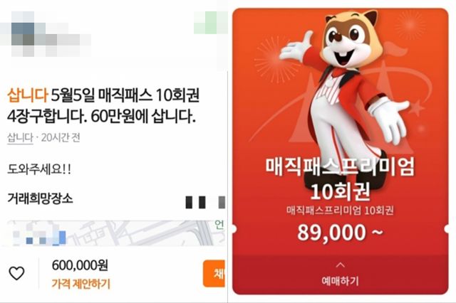 실제로 지난 3일 중고 거래 플랫폼 ‘당근마켓’에는 어린이날 롯데월드 매직패스 10회 권 4장을 60만 원에 구매하겠다는 글들이 올라왔다.