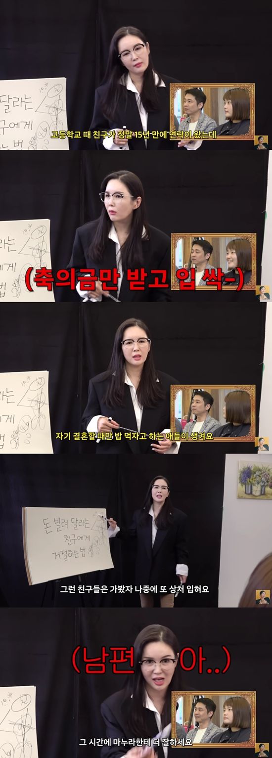 이날 장영란은 다양한 인간관계 꿀팁을 전수했다. 먼저 '돈 빌려 달라는 친구에게 거절하는 법'에 대해 장영란은 "친한 친구가 만약에 200만 원을 빌려달라고 하면 50만 원만 준 다음에, 더 못 줘서 미안하다고 해라. 그리고 그 친구한테 (50만 원을) 아예 줬다고 생각해라. 받을 생각 마라. 그러면 그 관계가 끊어진다. 친한 친구면 거의 다 갚더라"라고 전했다.