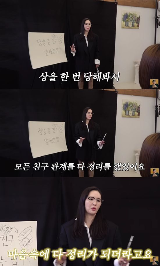 '평생 친구'에 대해서도 언급했다. 장영란은 "20대 때는 잘 몰랐는데 40대 되니까 느낌이 온다. 20~30대 때는 마음 주면서 많이 만나라"며 "나이 들어서 상 당했을 때 오래갈 친구인지 판가름이 난다. 저는 상을 한 번 당해봐서 그때 모든 친구 관계를 다 정리했다. 좋은 친구인지, 아닌지 마음속에 다 정리가 되더라"라고 이야기했다.