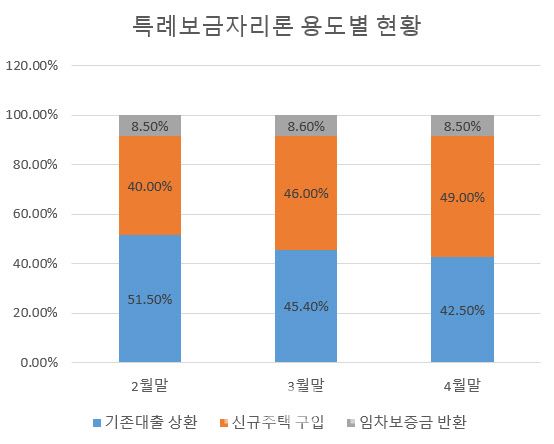 금액기준으로는 신규주택 구입이 15조1575억원으로 49%를 차지했다. 이어 기존대출 상환이 13조1623억원(42.5%), 임차보증금 반환이 2조6210억원(8.5%)이었다. 시계열(금액기준)로 보면 신규주택 구입 비중은 출시 첫달이었던 2월말 40%에서 3월말 46%, 4월말 49%로 계속 커지고 있다. 반면 기존대출 상환은 51%(2월말)→45.40%(3월말)→42.50%(4월말)로 점차 줄고 있다. 임차보증금 반환 용도는 8.5%(2월말)→8.60%(3월말)→8.5%(4월말)로 별 변화가 없다.