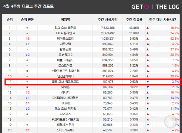 '월드 오브 워크래프트'는 11위로 아깝게도 톱10에 들지 못했다. 전주 대비 사용 시간은 3.7%가 감소햇다. 최고 52.8%가 늘어난 '메이플 스토리'나 24.2%가 늘어난 '피파온라인4'에 비교하면 우울한 수치다. 블리자드의 '디아블로2: 레저렉션'이나 같은 핵앤 슬레시 게임 '패스 오브 엑자일'도 전주 대비 사용시간이 크게 줄었다.