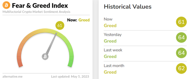 비트코인의 투자심리는 전날보다 소폭 위축된 모습이다. 이날 암호화폐 데이터 제공 업체 얼터너티브(Alternative)의 자체 추산 '공포·탐욕 지수'는 전날보다 3포인트 내린 61를 기록했다. 다만 '탐욕' 단계는 지속됐다. 해당 지수는 0에 가까울수록 시장의 '극단적 공포'를 나타내며, 100에 가까울수록 '극단적 낙관'을 의미한다.