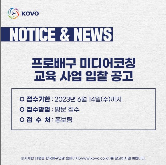 [아이뉴스24 송대성 기자] 한국배구연맹(KOVO)이 문화체육관광부와 국민체육진흥공단이 지원하는 프로배구 미디어 코칭 교육 사업을 수행할 운영 대행업체를 모집한다고 5일 밝혔다.