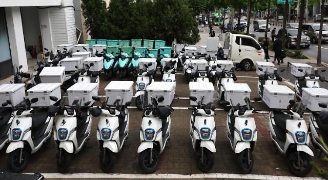 5日是韩国儿童节,韩国最大外卖平台之一“外卖的民族”因劳资双方团体交涉破裂宣布当天进行罢工。图为位于首尔江南区的外卖民族南部中心前停放的大量外卖骑手摩托车。