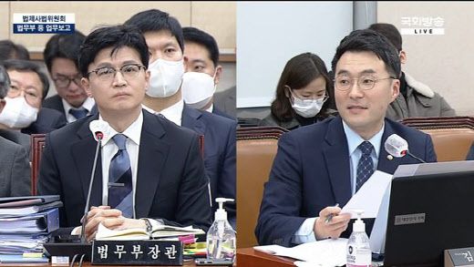 지난 2월 국회 법제사법위원회 전체회의에서 한동훈 법무부 장관(왼쪽)에게 질의하는 김남국 더불어민주당 의원.(사진 출처= NATV국회방송 캡처)