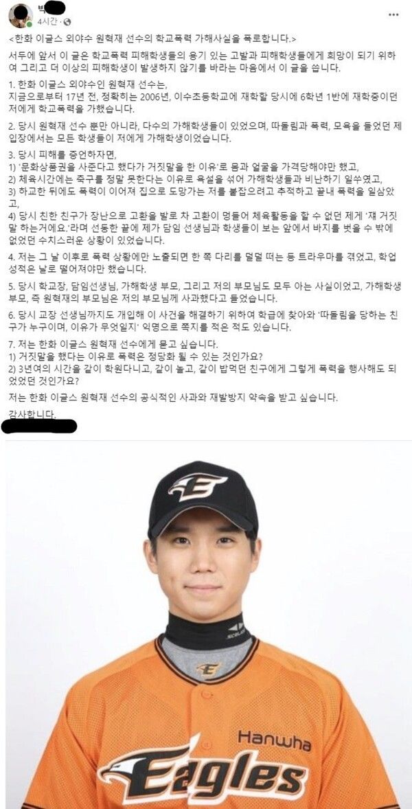 바로 초등학교 때 현 프로야구 선수인 동급생이 낀 무리에게 학교폭력을 당했다는 것이다.
