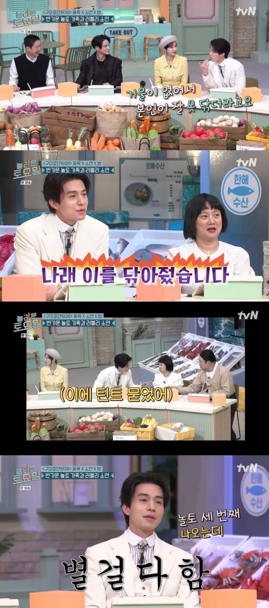 그러자 이동욱이 "나래 양 앞니에 틴트가 좀 묻었다. 거울이 없어서 본인이 잘 못 닦더라. 그래서 제가 나래 이를 닦아줬다. 제가 살다 살다"라고 해명했다.