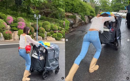공개된 영상에는 이시영이 내리막길과 오르막길에서 두 아이가 앉아있는 수레를 밀고 있는 모습이 담겨 이목을 끌었다.