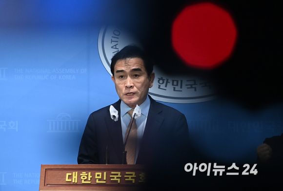 태영호 국민의힘 최고위원이 3일 오후 서울 여의도 국회 소통관에서 공천 녹취록 사태와 쪼개기 정치후원금 의혹에 대한 입장 발표 기자회견을 하고 있다. [사진=김성진 기자]