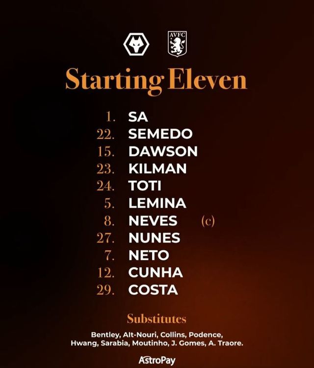 경기를 앞두고 양 팀 선발 명단이 발표됐다. 홈팀 울버햄튼은 4-4-2 포메이션으로 시작한다. 최전방은 디에고 코스타와 마테우스 쿠냐가 포진한다. 중원은 마테우스 누네스, 마리오 레미나, 후벵 네베스, 페드로 네투가 구성한다. 4백은 넬송 세메두, 막시밀리안 킬먼, 크레이그 도슨, 토티 고메스가 호흡한다. 골문은 조세 사가 지킨다.
