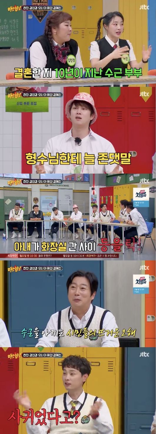 김민경 또한 “지연이도 우리랑 같이 모임을 하다가도 시간이 되면 남편 밥해주러 간다”라고 첨언했고 김희철은 “대기실에서도 통화를 하면 형수님에게 꼭 존대말을 한다”라고 말하며 동의했다.