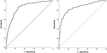 분석 결과, 판별 정확도를 나타내는 곡선하면적(AUC)에서 트레이닝 셋의 특이도(Specificity)는 0.856(95% CI, 0.815-0.897), 밸리데이션 셋의 특이도는 0.866(95% CI, 0.799-0.934)으로 각각 나타났다. AUC가 1에 가까울수록 그 정확도가 높다는 것을 의미한다.