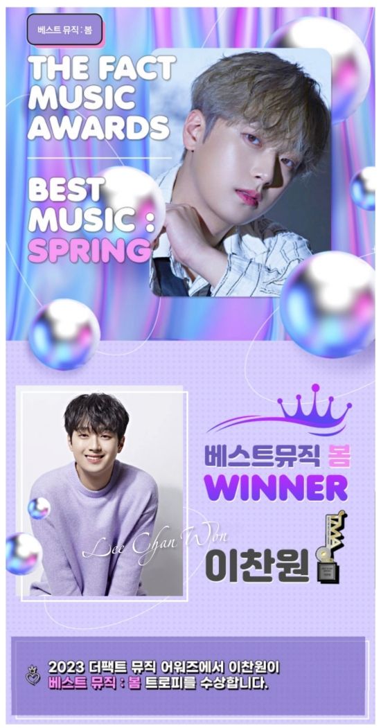 한편, '2023 더팩트 뮤직 어워즈 베스트 뮤직-봄' 부문 1위를 차지한 이찬원에게는 특전으로 트로피가 수여될 예정이다.