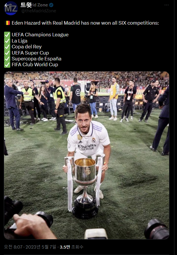 아자르는 이로써 2019년 여름 레알 입단 이후 들어 올릴 수 있는 모든 트로피를 다 들어 올리게 됐다.