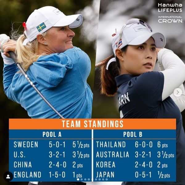 고진영, 김효주, 전인지, 최혜진이 출전한 대표팀이 여자골프 국가대항전인 한화 라이프플러스 인터내셔널 크라운(총상금 200만달러) 조별리그 B조에서 일본을 꺾고 2점을 따내 '꼴찌'를 면했다.
