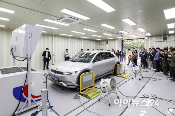 이날 센터에서 차대동력계(Chassis Dynamometer)를 활용한 전기차 주행 재현 실험을 살펴볼 수 있었다. 현대자동차의 전기차 아이오닉5 4WD가 구동을 시작했고, 강풍기가 굉음을 내며 4개의 바퀴에 거센 인공 바람을 쐈다. 실제 주행 환경과 최대한 비슷하게 재현하기 위함이다.
