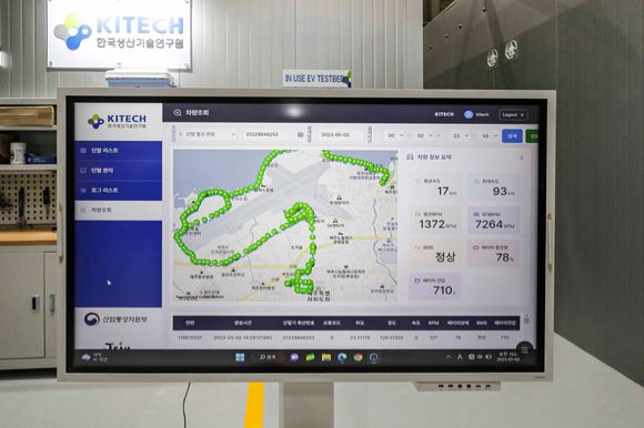이어 모니터링 장비가 수집한 데이터가 아이오닉5 앞쪽에 위치한 디스플레이를 통해 나타났다. 최대 주행가능 거리와 차의 현재 성능 등을 확인할 수 있다. 이 장비로 전기차의 고장 유형 분석과 고장 모사 테스트, 주행 거리별 노후화 테스트도 가능하다.
