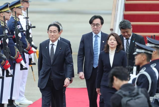 7日,日本首相岸田文雄和夫人岸田裕子抵达城南首尔机场,正式开启对韩国为期两天的工作访问。