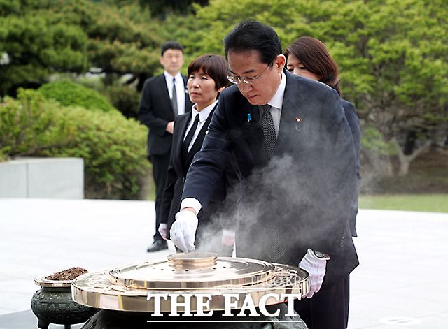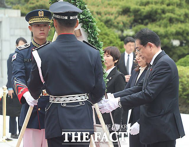 기시다 총리는 방한 첫 일정으로 서울 동작동 국립현충원을 찾아 헌화했다. 일본 총리가 현충원을 찾은 것은 2011년 10월 방한한 노다 요시히코 총리 이후 12년 만이다.