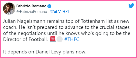 그러면서 "그러나 나겔스만 감독은 스포츠 디렉터가 누군지 알기 전까지 토트넘과 협상을 이어갈 준비가 되지 않았다"고 설명했다.