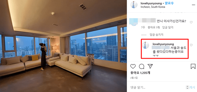 2020년 4월 현영은 자신의 SNS를 통해 "간만에 아들하고 달콤한 시간"이라는 글과 함께 송도의 전경이 한눈에 보이는 자택에서 찍은 사진을 공개했고 평소 사진의 배경이었던 청담동 소재의 집과 다른 것을 알아챈 네티즌들이  "이사했느냐"라고 묻자 "서울과 송도를 왔다 갔다 한다. 이곳은 세컨드하우스"라고 답했습니다.