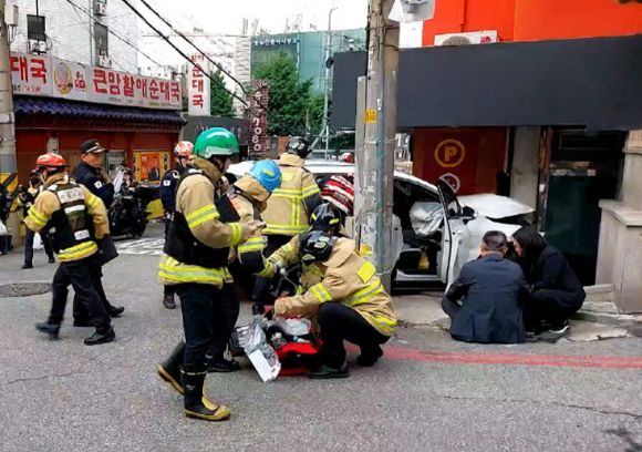 [아이뉴스24 백소연 기자] 서울 신촌 인근에서 SUV 차량이 주차된 카니발 차량과 추돌 후 건물로 돌진하는 사고가 발생했다.