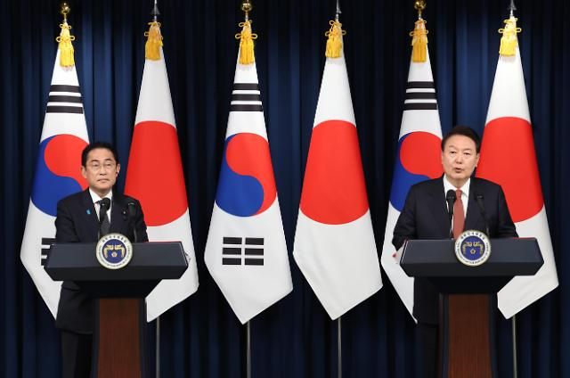 7日,韩国总统尹锡悦(左)与日本首相岸田文雄在会谈后出席联合记者会。【图片提供 韩联社】