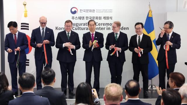 当地时间8日,韩国国务总理韩德洙(中)出席驻瑞典韩国文化院成立仪式。【图片提供 韩联社】