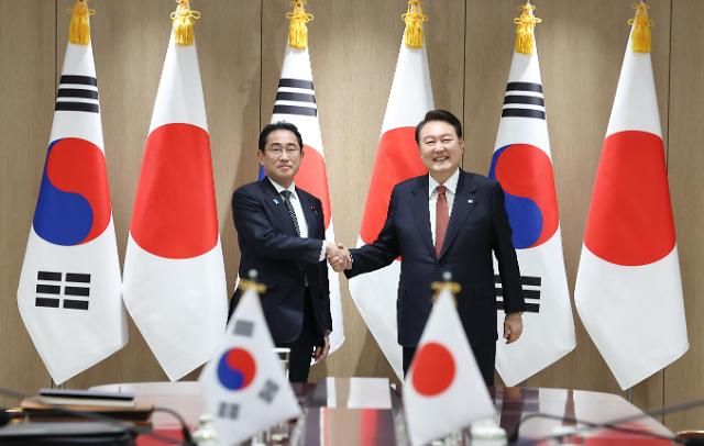 7日,在龙山总统府,韩国总统尹锡悦(右)与日本首相岸田文雄举行会谈。【图片提供 韩联社】