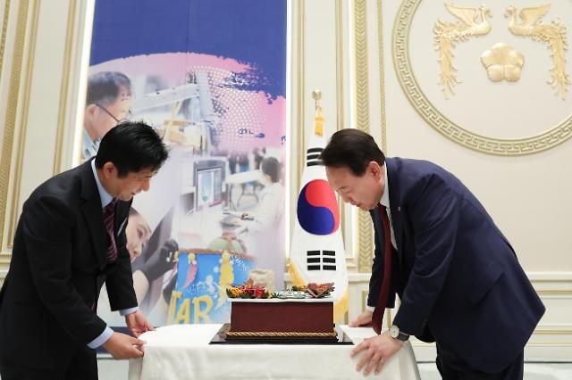 韩国总统尹锡悦即将于10日迎来就任一周年。9日,在原总统府青瓦台迎宾馆内,尹锡悦邀请第十届国际残疾人职业技能竞赛韩国代表团共进午餐,收到运动员送上的巧克力工艺品,祝贺他就任总统一周年。