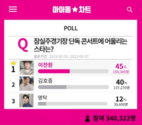 최근 아이돌차트는 "잠실주경기장 단독 콘서트에 어울리는 스타는?"이라는 주제로 투표를 진행했다. 이 투표는 5월 1일부터 5월 7일까지 일주일간 진행됐다.