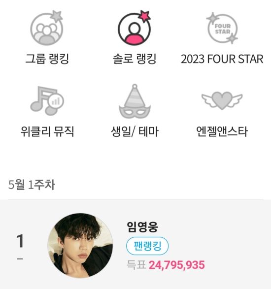 (엑스포츠뉴스 이정범 기자) 임영웅이 '팬앤스타' 5월 1주 차 솔로랭킹 1위에 올랐다.