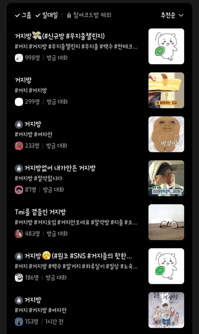 (뉴스영 민희윤 기자)최근 새로운 카카오톡 오픈채팅방 '거지방‘이 사용자들 사이에서 인기를 얻고 있다. '거지방'은 '가난한' 또는 '검소한'을 의미하는 '거지'와 '방'을 의미하는 합성어다. 사람들이 일상 생활을 공유하고 돈을 절약하도록 서로 격려하는 곳입니다. 사용자는 일반적으로 게시물에 "절약", "일상" 또는 "하루살이"이라는 해시태그를 붙인다.