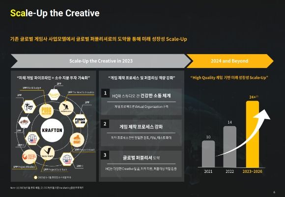 크래프톤은 '스케일 업 더 크리에이티브(Scale-up the Creative)' 전략에 속도를 낸다. 스케일 업 더 크리에이티브는 자체 개발 게임과 소수 지분 투자를 통해 국내외 이용자가 만족할만한 크리에이티브를 발굴, 성장성을 극대화하는 방식이다. 세계적 퍼블리셔로 자리매김하겠다는 뜻이다.